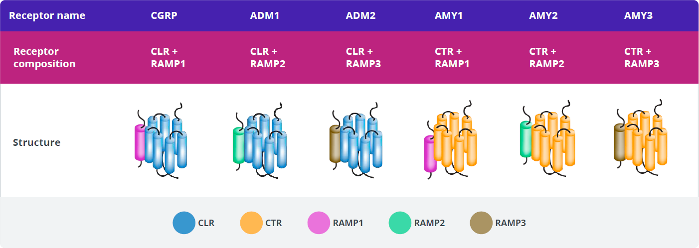 Each receptor is a heterodimer consisting of a receptor activity-modifying protein (RAMP) and either the calcitonin receptor (CTR) or calcitonin receptor-like receptor (CLR) G-protein–coupled receptor (GPCR) signaling subunit.2
